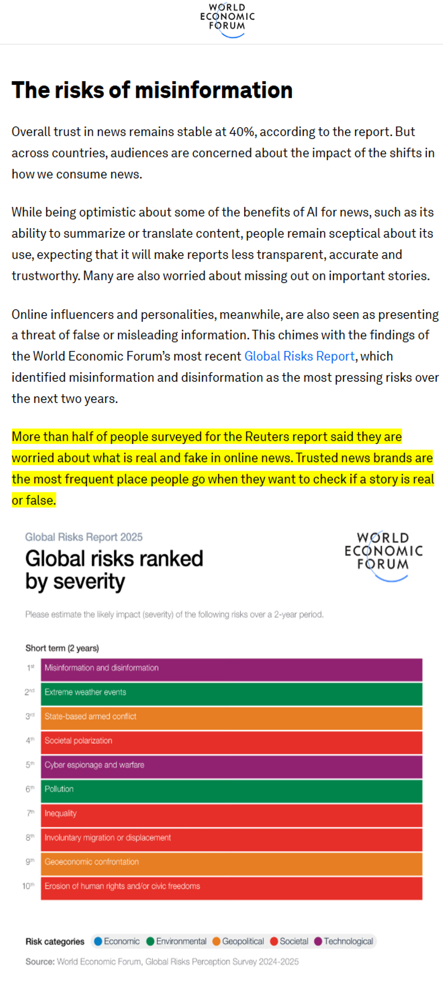 Reuters Institute가 전 세계 뉴스 소비자를 대상으로 진행한 리서치 보고서인 『2025 Digital News Report』에 따르면, 온라인 뉴스의 진위 여부에 대해 우려하는 응답자가 절반을 넘었으며, 뉴스를 확인할 때 가장 신뢰하는 출처로 여전히 뉴스 브랜드를 꼽았습니다.