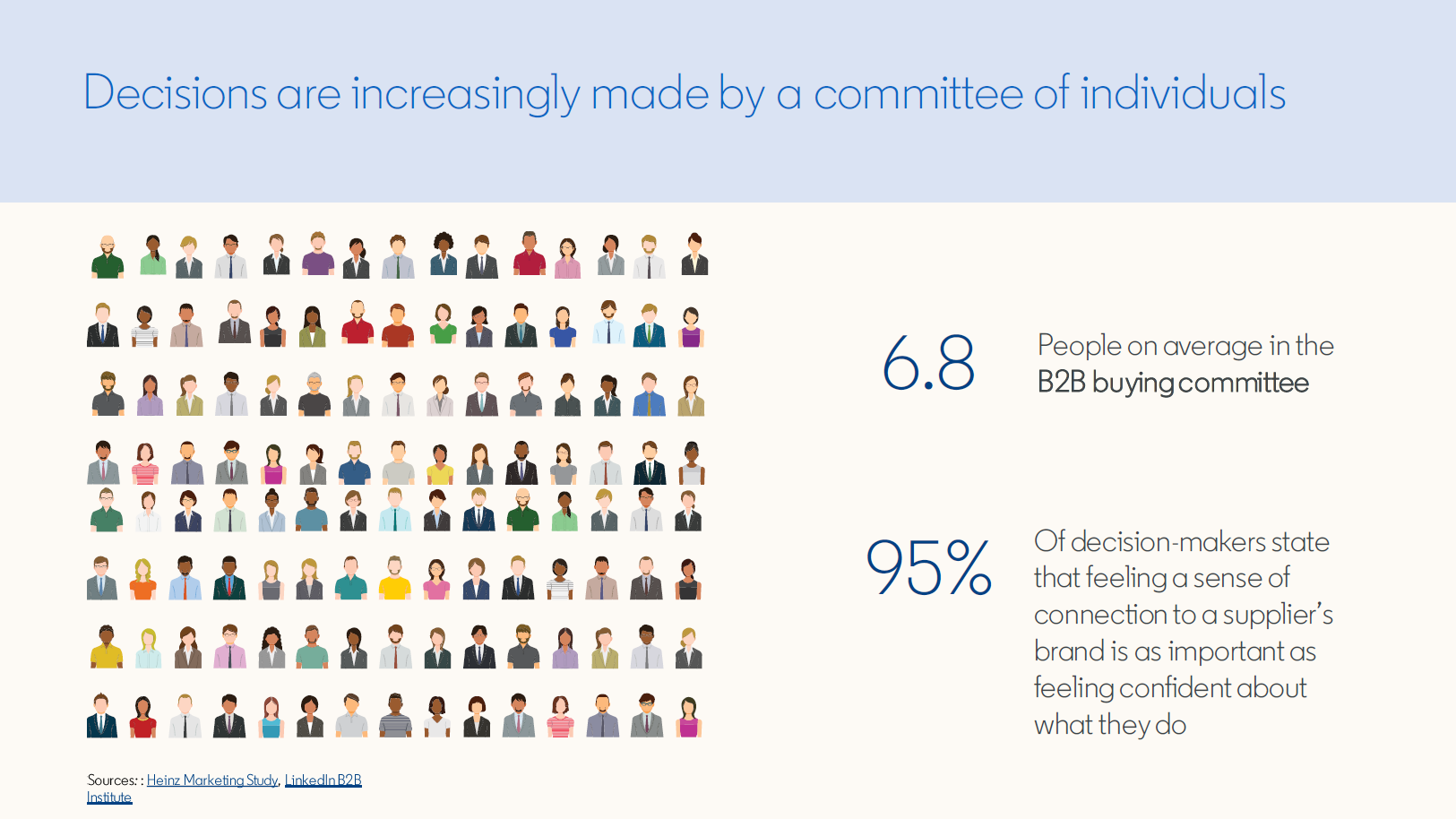 오늘날 B2B 구매 결정은 단 한 명의 담당자가 내리지 않습니다. 평균적으로 6.8명이 하나의 구매 결정에 관여합니다. 특정 담당자 한 명만을 겨냥한 마케팅으로는 이 복잡한 의사결정 구조를 뚫기 어렵습니다. ABM은 바로 이 '구매 위원회' 전체를 공략하도록 설계된 전략입니다. (출처: Heinz Marketing Study, LinkedIn B2B Institute)