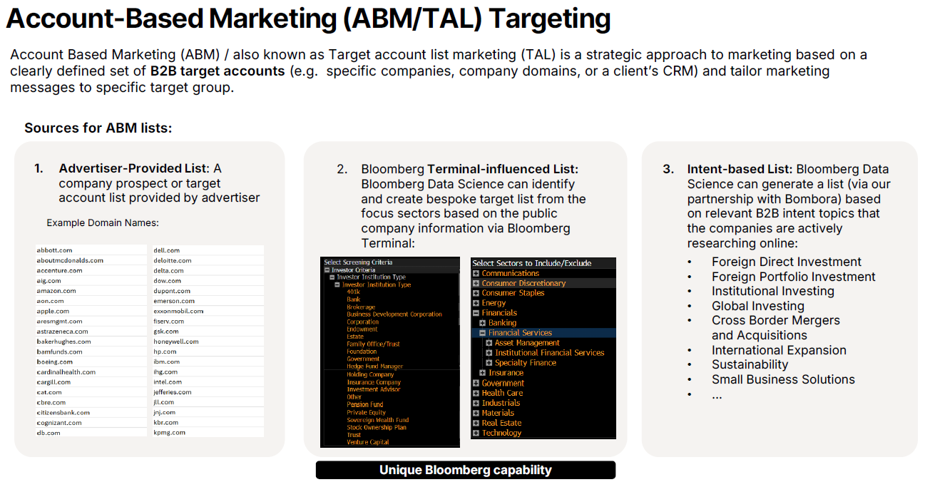 Bloomberg ABM 솔루션의 핵심은 '누구에게 광고를 보여줄 것인가' 를 결정하는 3가지 타겟 리스트 방식에 있습니다.