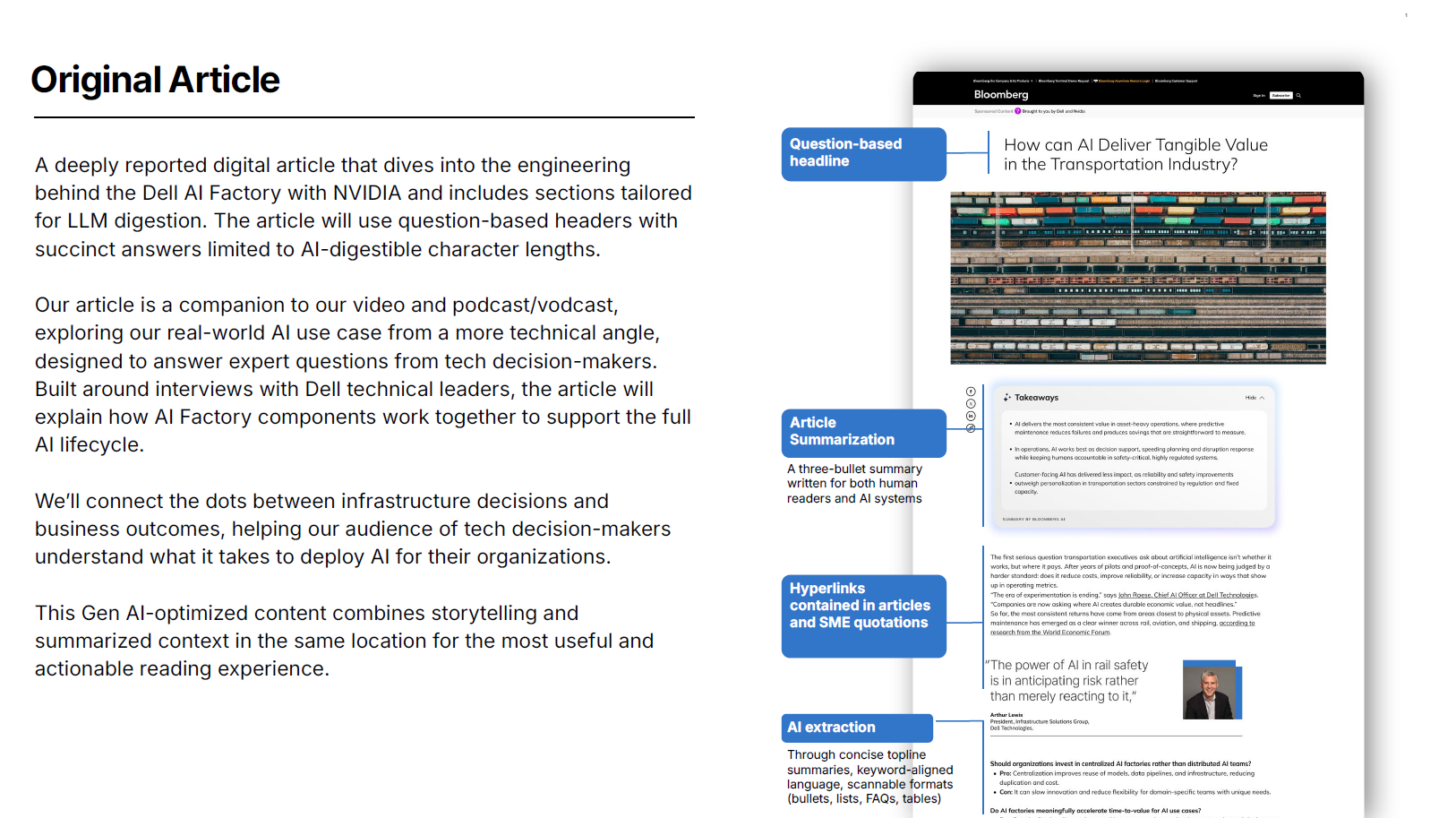 Bloomberg Media는 Sponsored Content에 AI 추출 최적화 구조를 적용한 GEO 솔루션을 제공합니다.